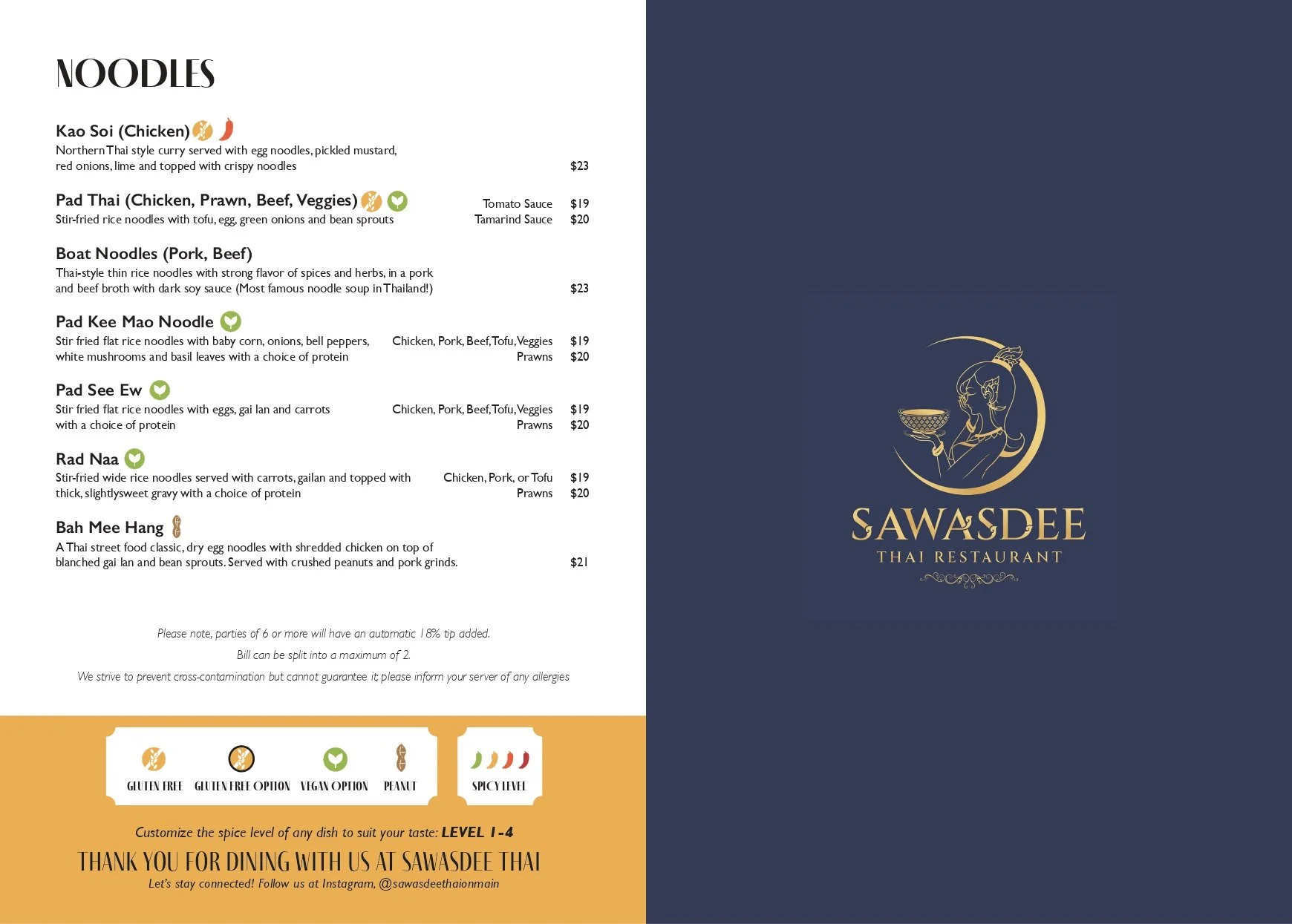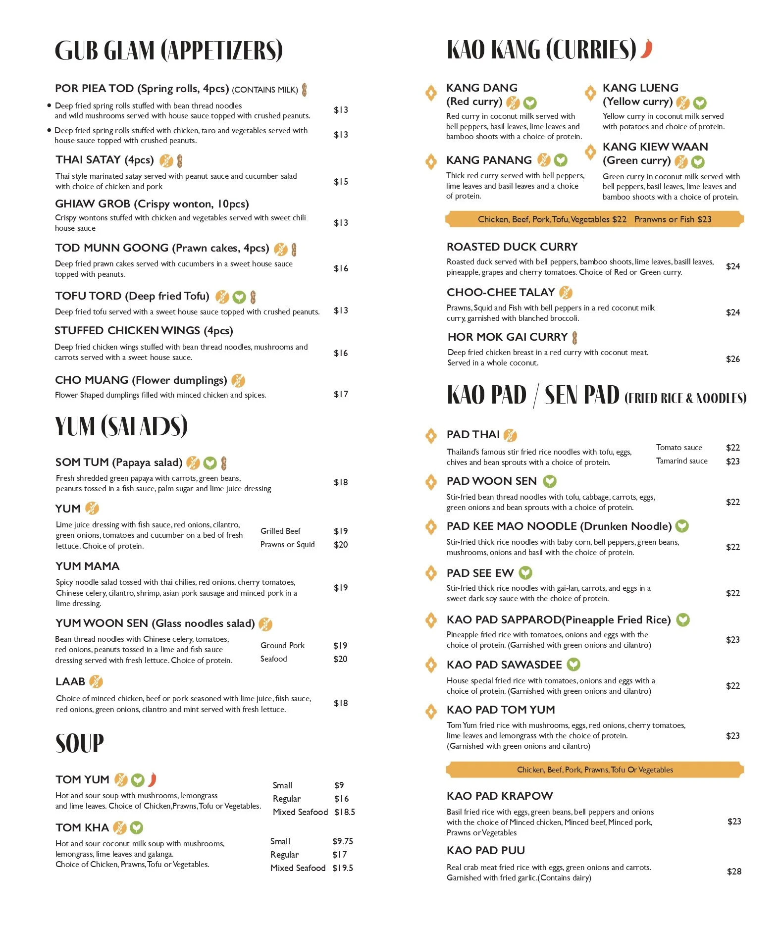 VG = Vegan | VG-O = Vegan Optional | GF = Gluten Free | GF-O = Gluten Free Optional • Please specify: Mild | Medium | Hot | Very Hot | Thai Hot